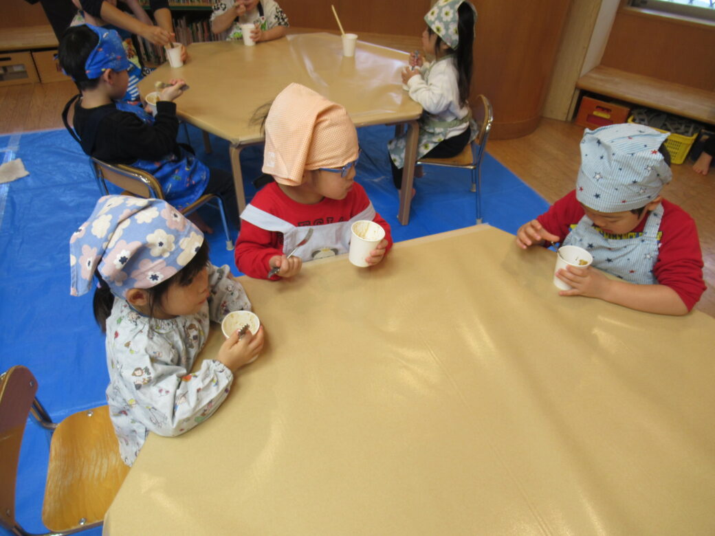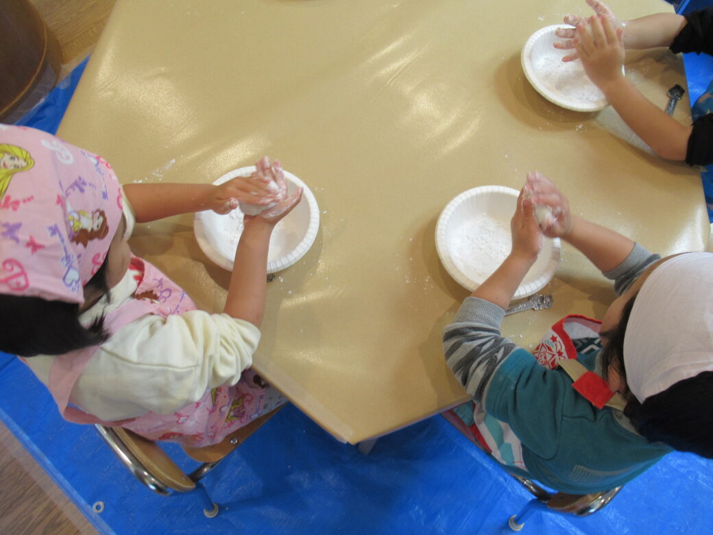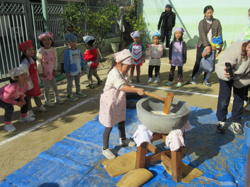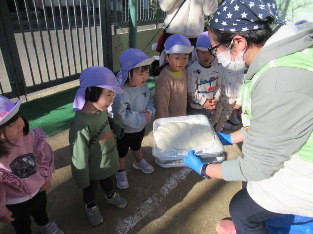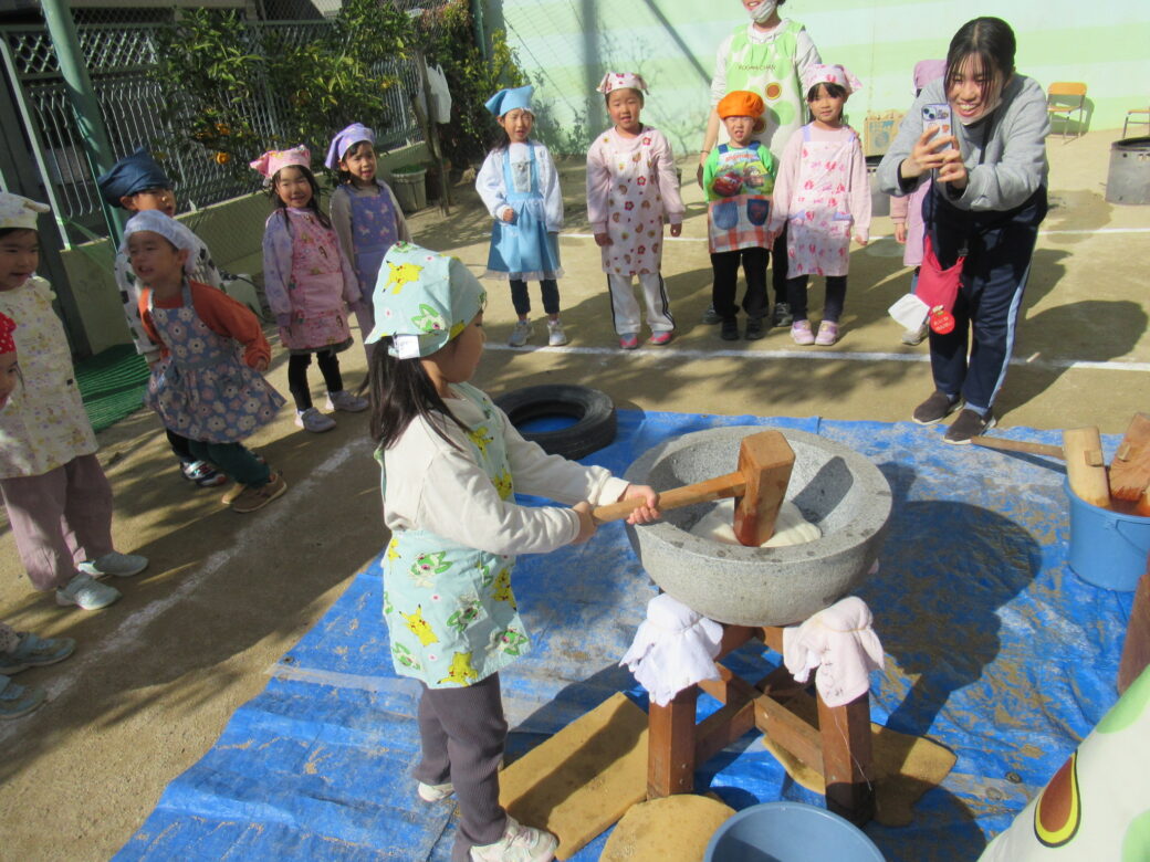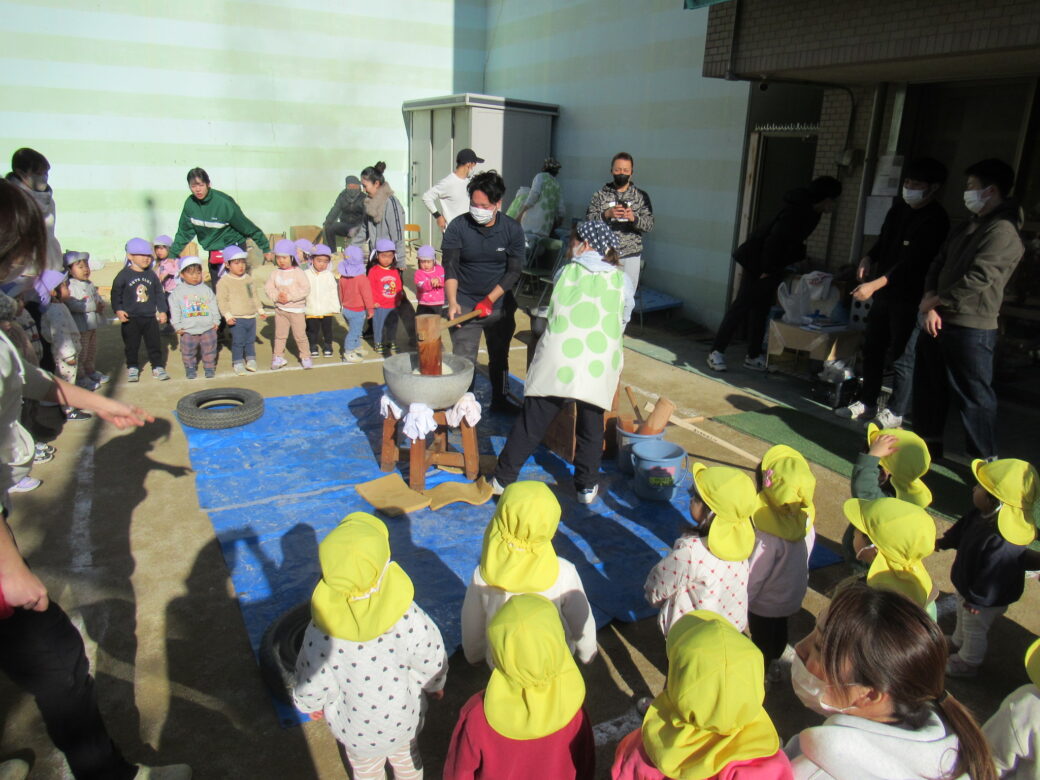 くま組、ぞう組の子どもたちは、おもちもついて、
